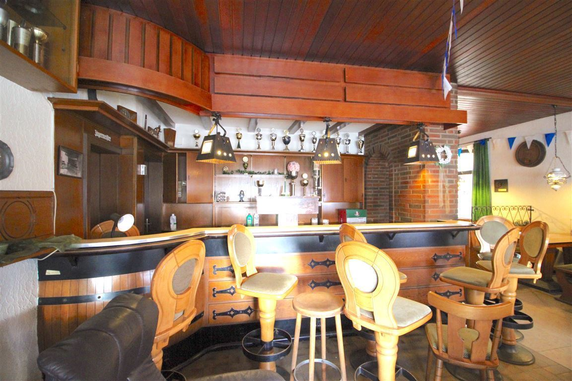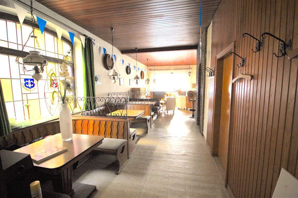Die Gastronomie im Erdgeschoss verfügt über eine Fläche von ca. 200 m², im rechten Bereich mit Bartheke, Sitzgelegenheiten, Cateringbereich, großen Saal und WCs für Damen und Herren. Linksseitig vom Hauseingang gibt es drei weitere Zimmer, die mit Küche und Wohnbereich sowie separatem Schlafzimmer als 2-Zimmer-Wohnung (ca. 50 m² + Bad) zusätzlich vermietet werden kann.