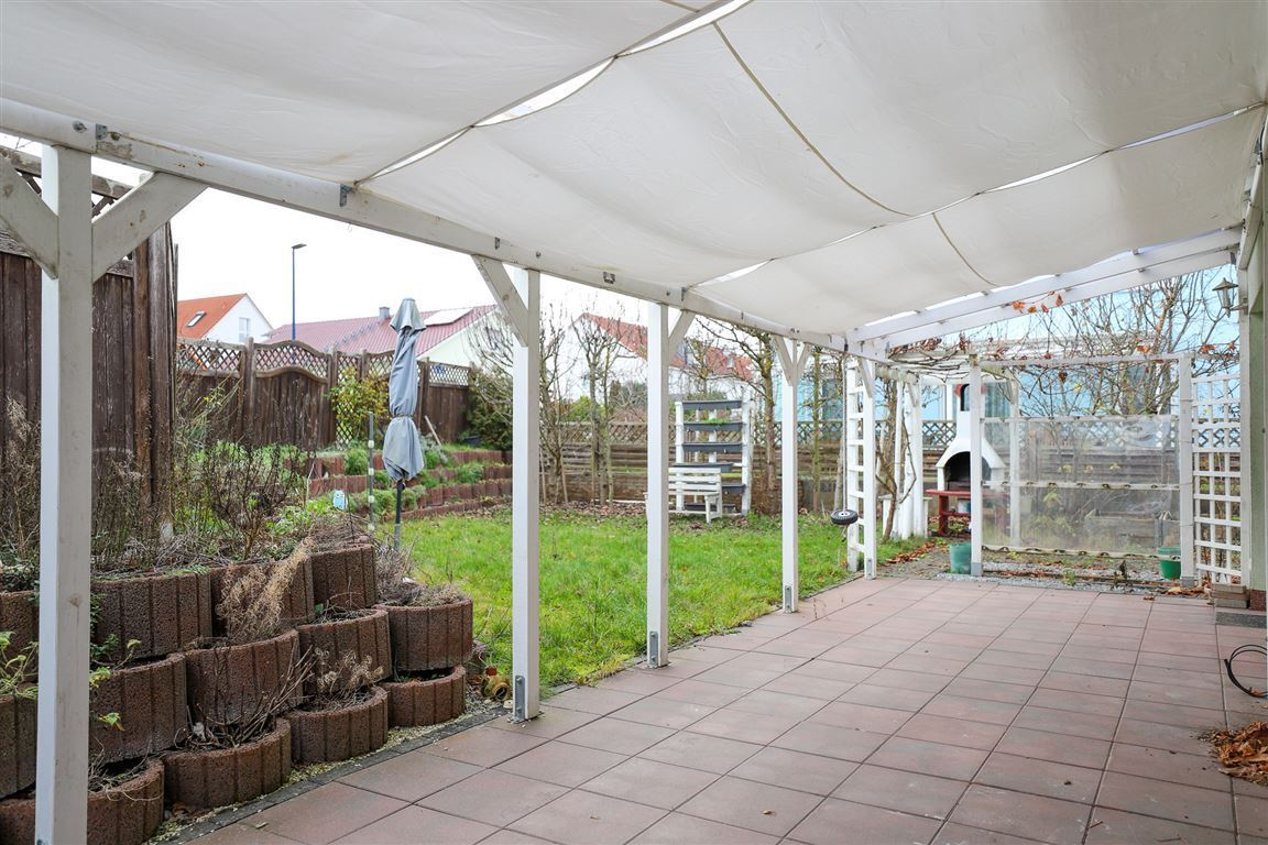 Ein besonderes Highlight ist die große überdachte Terrasse im Erdgeschoss, die von beiden Wohnbereichen aus zugänglich ist und den Übergang in den Garten harmonisch gestaltet. Der Garten bietet ausreichend Platz für Beete, Gemüseanbau oder entspannte Stunden im Freien. Ein Gartenhaus ergänzt den Außenbereich sinnvoll und bietet zusätzlichen Stauraum. Zwei Stellplätze direkt vor dem Haus runden dieses attraktive Immobilienangebot ab.