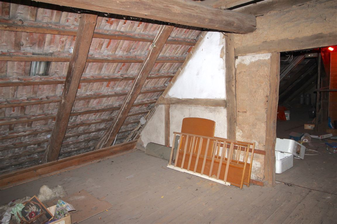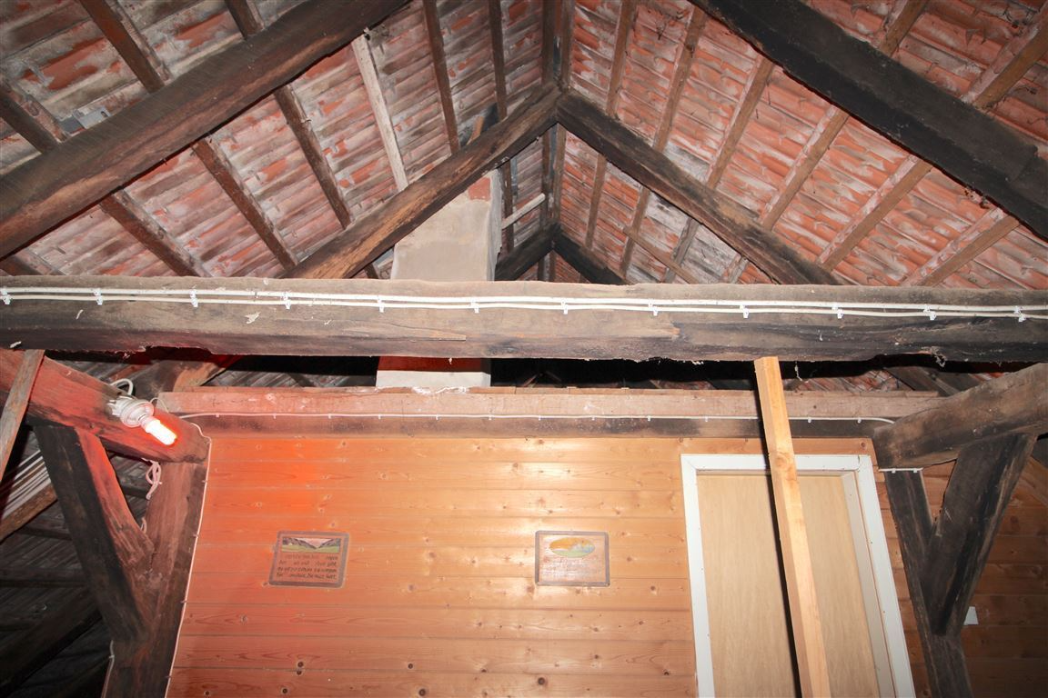 Der Dachboden ist mit Elektrik ausgestattet und wird derzeit über einen einfache Holztreppe vom Obergeschoss aus betreten. Ein Gästeraum ist hier bereits abgetrennt, weitere Räume könnten durch Wandeinzug geschaffen werden. Der Dachboden verfügt über ein Kaltdach; Verlattung und Einziegelung ohne Unterzugplane und ohne Dämmung. Auf dem Fußboden sind Holzdielen verlegt.