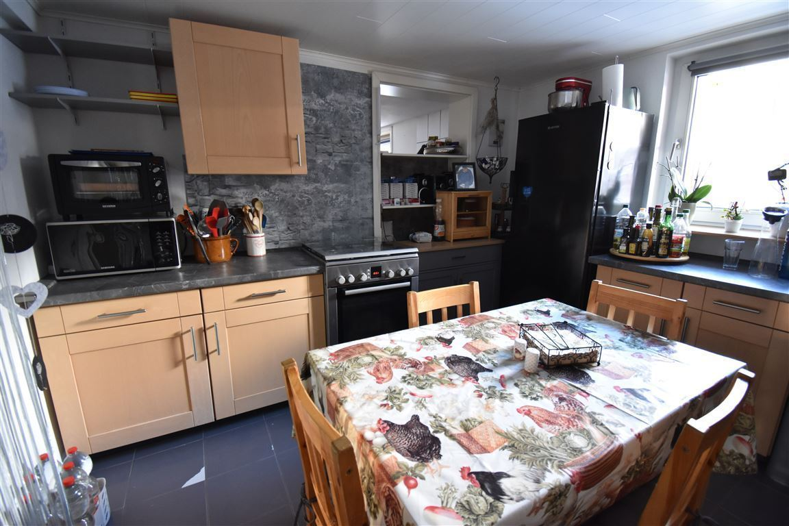Das Erdgeschoss wurde in massiver Bauweise errichtet und vermittelt ein solides, traditionelles Gefühl. Hier befindet sich eine gemütliche Einbauküche, die funktional und einladend ist. Ebenfalls auf dieser Etage finden Sie ein Wohnzimmer mit großem Küchenherd, der die ganze untere Etage mit Wärme versorgen kann, und ein Badezimmer. Diverse Abstellräume kompensieren sehr gut den nicht vorhandenen Keller. Ebenfalls auf dieser Etage ist der Heizungsraum mit angrenzendem Öllager sicher untergebracht.