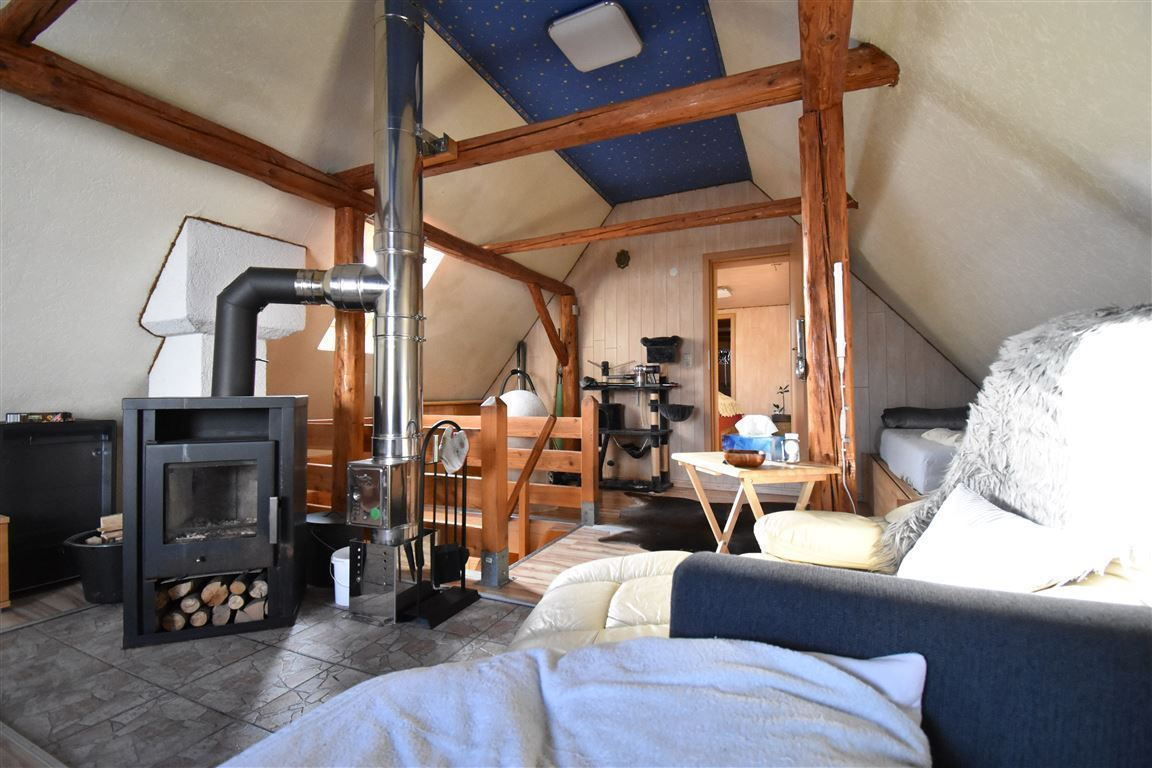 Weiter geht es über eine Holztreppe in das ausgebaute Dachgeschoss, welches hervorragend gedämmt wurde. Hier befindet sich ein gemütlicher Wohnraum mit Kaminofen, der für eine behagliche Atmosphäre sorgt. Ein Schlafzimmer und ein weiterer Raum zu verschiedener Nutzung.